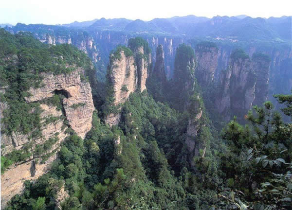 這就是大觀臺。極日遠(yuǎn)眺,千百座奇峰盡收眼底。一位詩人說,武陵源的砂巖石峰是一步一觀景,千步千造型,一山有四季,十步不同大。專家測算出武陵源石峰有3103座。一如一位高超的雕塑大師,模擬宇宙萬物,無不形態(tài)逼真,維妙維肖,栩栩如生,呼之欲動。有的如海螺出水,有的如金龜銜日,有的如蓮花盛開,有的如天橋橫空,有的如長槍刺大,有的如寶塔聳立,有的如老人采藥,有的如玉女梳妝,有的如將軍出征,有的如戰(zhàn)馬長嘯,有的如情人幽會,有的如夫妻相擁,有的如仙女散花,有的如村姑守望……有的孤峰獨(dú)秀,有的直插云霄,有的婷婷玉立,有的威武勇猛,有的小巧玲瓏,有的大氣磅礴。進(jìn)入武陵源,但見一片峰的森林,峰的世界,峰的海洋。挺拔、奇秀、集中、原始、粗獷、古野。這就是武陵源。 一位藝術(shù)大師說:武陵源的山峰,改寫了山的概念。大攝影家陳勃說 :“三山五岳堪比美,華夏風(fēng)光第一流!蓖趵^杰先生說:“武陵源上二日游,勝讀千篇李杜詩!痹S世杰先生說:“秀幽險峻稱奇絕,五岳黃山拜·卜風(fēng)!崩畛扇鹣壬鸀榇舜蟊Р黄剑骸吧裰輨倬罢l為最?須請霞公重評勘!笨上煜伎蜔o緣到大觀臺來,也不可能為武陵源作甚評價了。