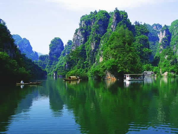 寶峰湖瀑布 湖中有兩座疊翠小島,近岸奇峰屹立,峰回水轉(zhuǎn)。泛舟漫游,只見一湖綠水半湖倒影,充滿詩(shī)情畫意!霸铺萑f丈上天臺(tái),高峽平湖一鑒開,王母瑤池金扶,浣沙仙女下凡來”游寶峰湖,你就會(huì)欣賞到這樣的詩(shī)情畫意。群峰擁抱的寶峰湖,長(zhǎng)約2.,5公里,湖猶如一面寶鏡,四面青山,一泓碧水,蕩槳溫游,格外愜意。坐在船上,環(huán)顧四周,千山聳翠,俯視水中,倒影慢移,碧水照相館得群峰綠,人面桃花水映紅。真是靜極了,美極了!韓劇《九天洞》拍攝的湖水就是寶峰湖。