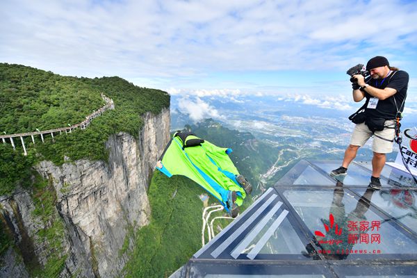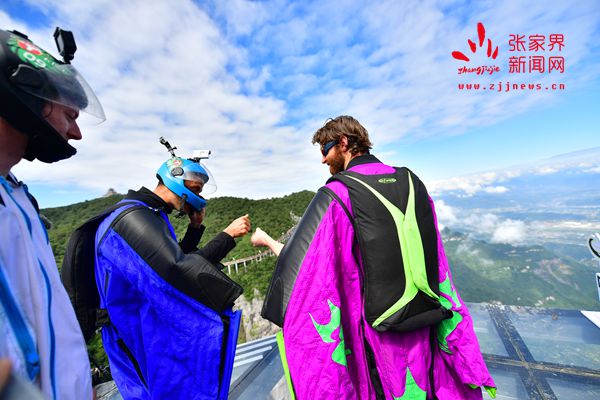 2017世界翼裝飛行世錦賽將于9月8日-10日在張家界天門山舉辦。開賽在即,9月7日上午,來自全球11個(gè)國家的16名翼裝飛行員從海撥1458米的張家界天門山玉壺峰頂一躍而下,在奇峰險(xiǎn)壑間進(jìn)行競(jìng)速訓(xùn)練。